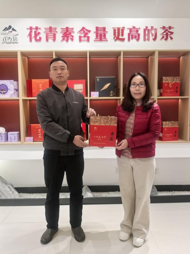 李明星经理代表望谟八步农业综合投资开发有限公司向贵州大学生命科学学院捐赠100份茶叶,价值20万元。牛素贞教授代表学院接受公司捐赠。这份价值20万元的礼品承载着茶企对贵州大学生命科学学院一直以来开展服务地方的认可。牛素贞教授表示,将持续推动科研成果与产业需求精准对接,让贵州大学生命科学学院的技术突破转化为茶农增收的实际效益,助力望谟这一“中国紫茶之乡”的特色产业绽放更强活力。