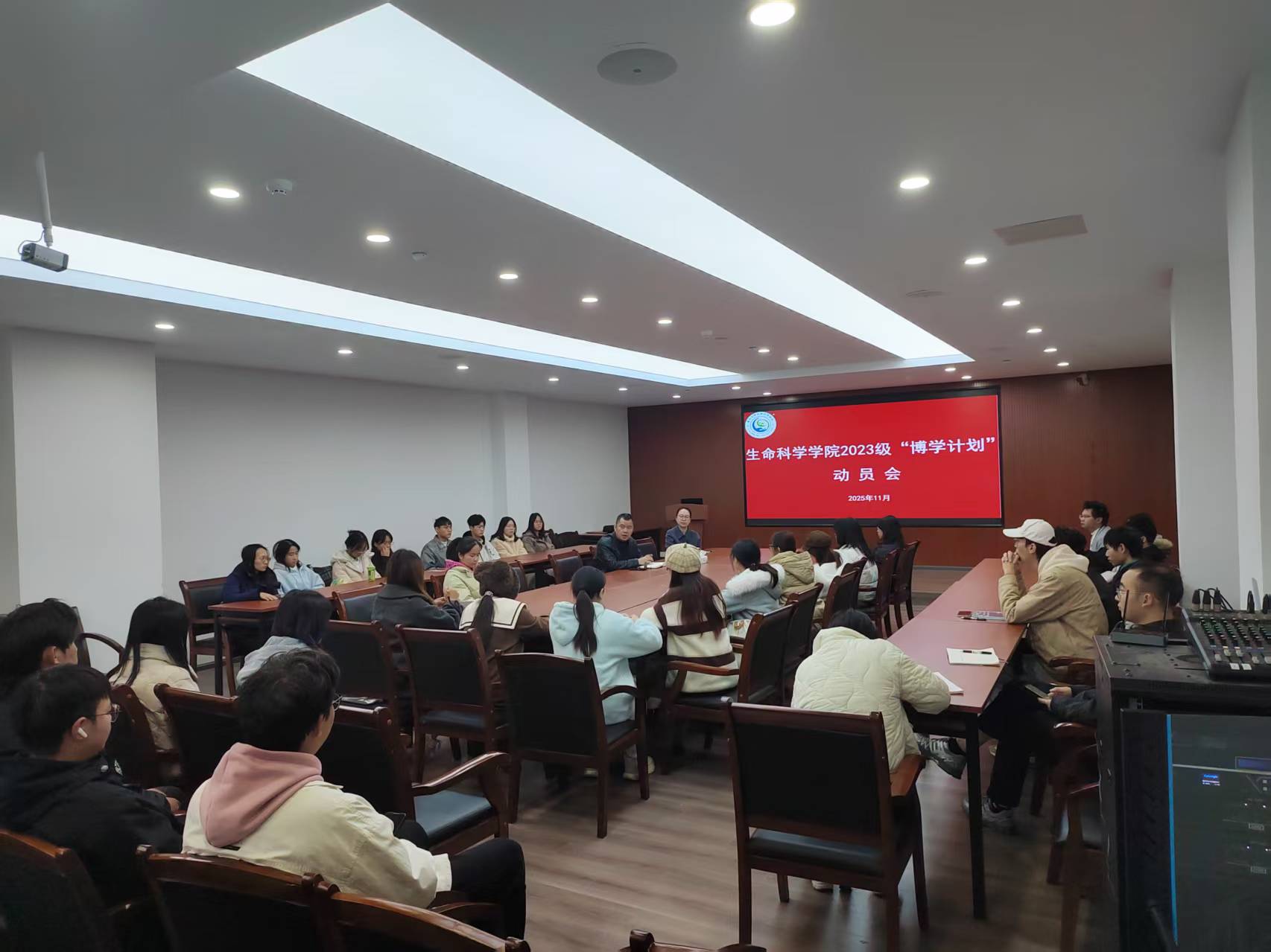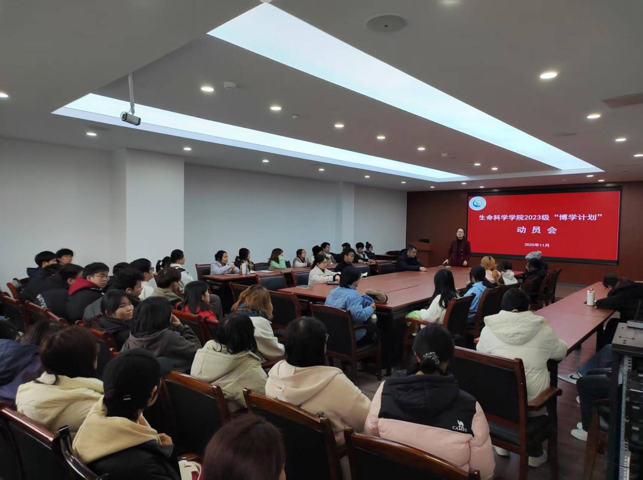 为帮助我院2023级本科生尽早明确考研目标、了解考研流程、科学掌握备考方法,营造学院积极向上的学习氛围,2025年11月18日-20日,生命科学学院分专业召开了2023级本科生“博学计划”考研动员会。院党委书记、关工委主任徐进出席会议,学生科科长冯胜强、班主任、2021级考研成功学生代表及全体2023级学生参加了会议,会议由院党委副书记、关工委常务副主任熊静主持。