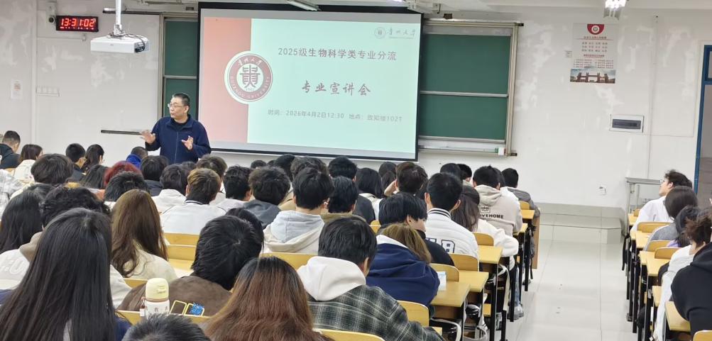 为引导2025级生物科学大类学生明晰专业方向、规划学业蓝图,2026年4月2日中午12时30分,在贵州大学南校区致知楼102教室召开2025级生物科学大类专业分流宣讲会。生命科学学院党委书记徐进、党委副书记熊静、分管教学副院长江龙、生物科学、生物技术、生态学三个专业教研室主任、学生科科长及教学科研科科长共同出席,与全体2025级生物科学大类学生面对面交流。
