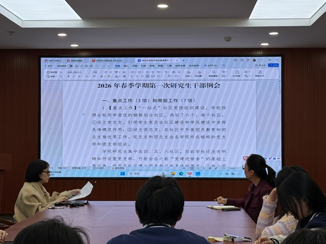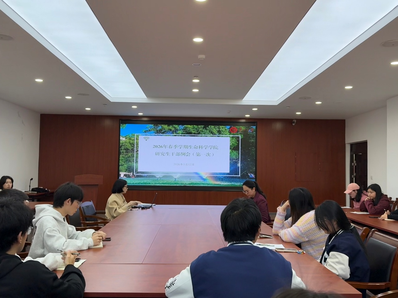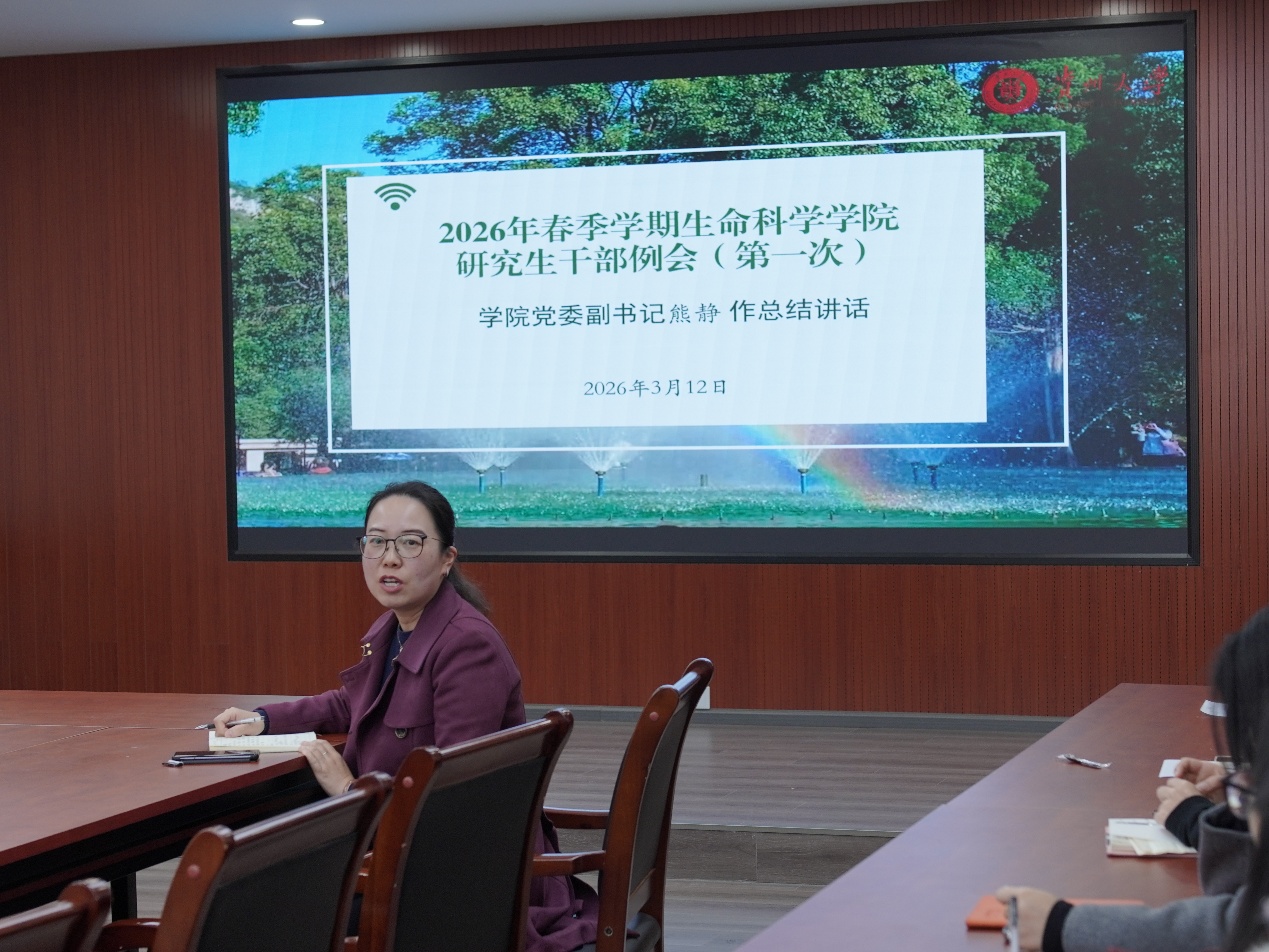 2026年3月12日,贵州大学生命科学学院2026年春季学期第一次研究生干部例会在崇德楼大会议室召开。学院党委副书记熊静出席,全体研究生干部参加了会议,会议由研究生专职辅导员司元艺主持。